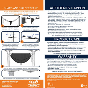 The Guardian Bug Net comfortably surrounds you and your hammock with its breathable SkyWeave™ Mesh to create a bug-free refuge, without cramping your style. Compatible with all ENO® hammocks (not including Sky-series and SuperNest hammocks).