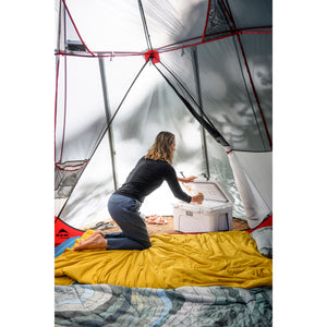 Vestibule Area 24.5 sq. ft / 2.27 sq. m Number of Poles 5 Aluminum 7000 Series Interior Height 77 in / 195 cm Length 120 in / 305 cm Floor Width 100 in / 254 cm Floor Area 83 sq. ft / 7.71 sq. m Packed Size 24 x 10 in / 61 x 25 cm Rainfly Fabric 68D taffeta polyester 1500mm Polyurethane & DWR Canopy Fabric 40D ripstop nylon & DWR Mesh Type 40D nylon micro-mesh Floor Fabric 68D taffeta polyester 3000mm Polyurethane & DWR -