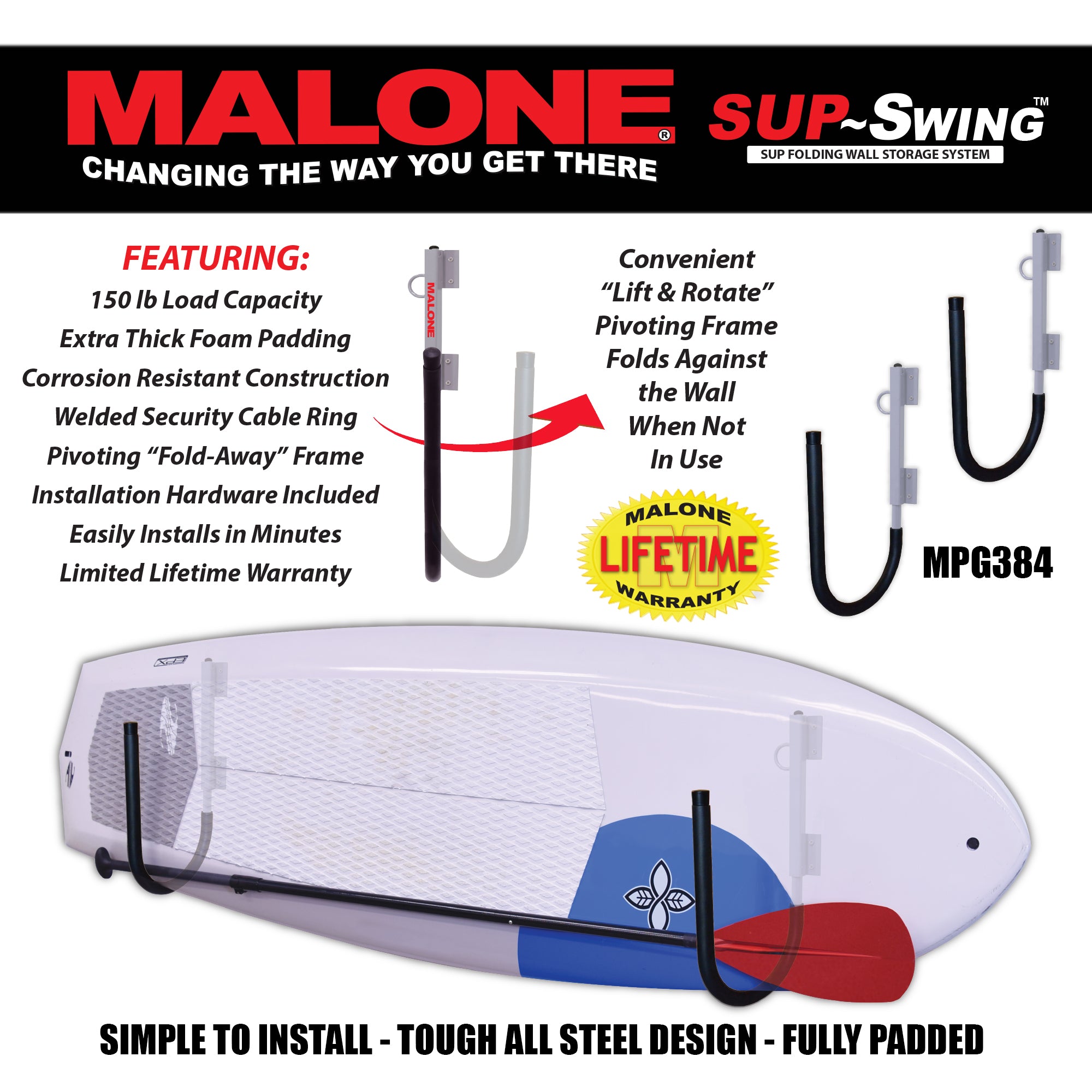 The SUPSwing™ Wall Storage Rack is fully padded and designed to hold a single SUP or surfboard. This system easily rotates 90 degrees when not in use. Includes a welded security cable ring, multi-point fastening system and all required mounting hardware.
