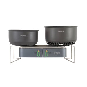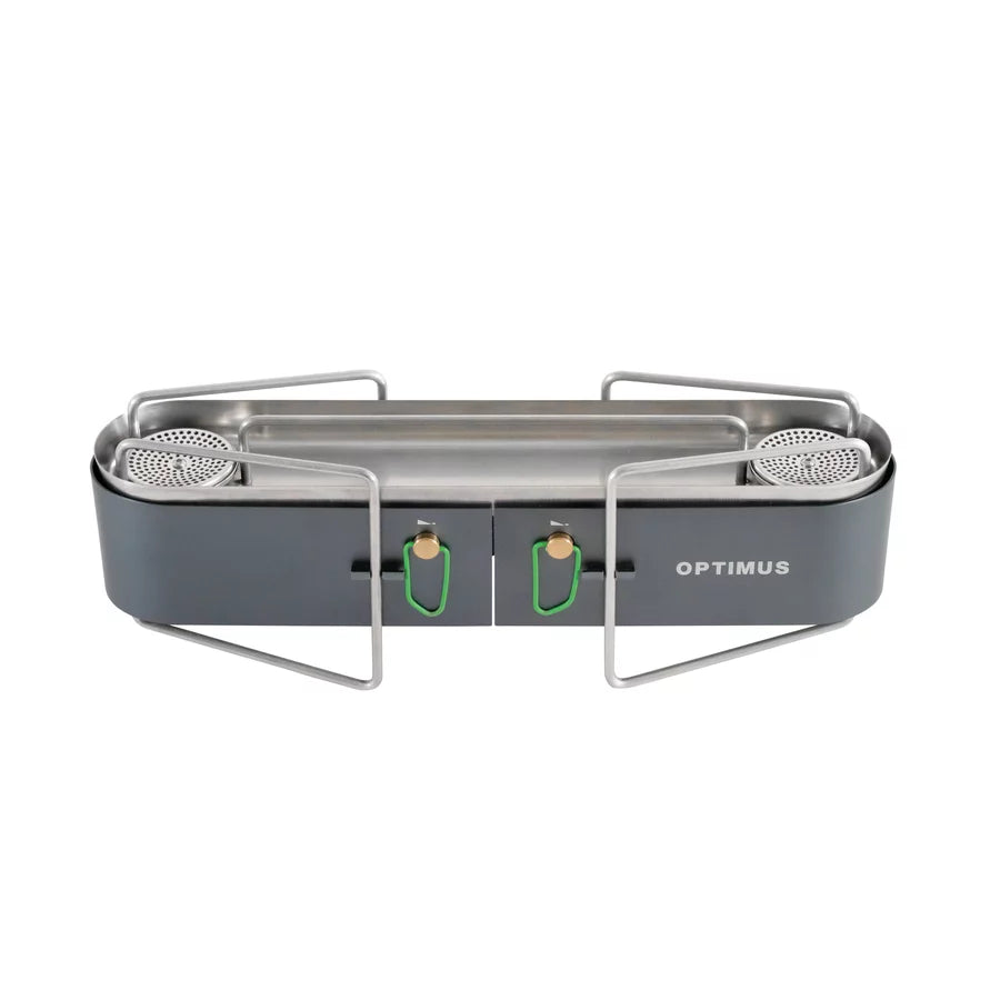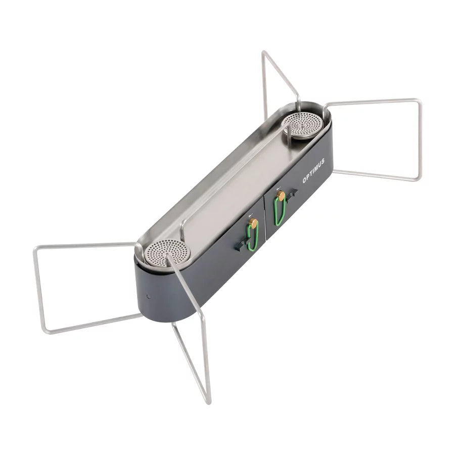 The Optimus Gemini Il makes it possible to cook real meals wherever you set up camp. Two powerful burners with independent control let you boil, simmer, or sear with ease. A low, stable frame and integrated wind protection keep flames steady, while a built-in pressure regulator maintains reliable heat in changing conditions.